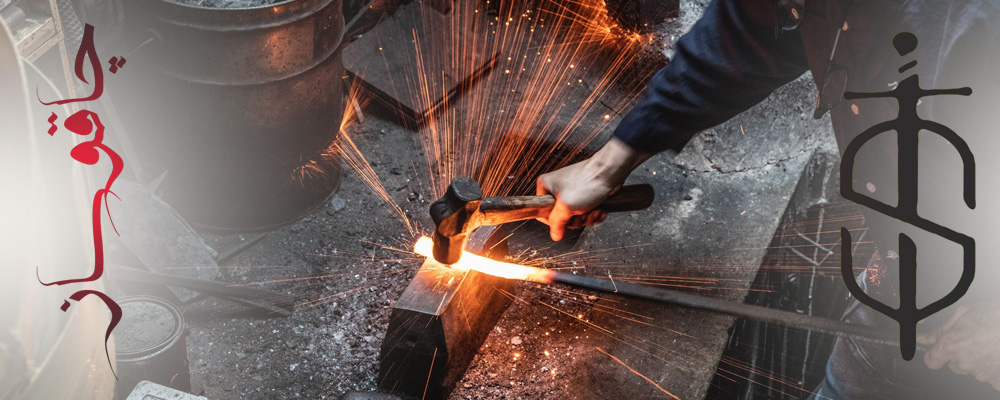 کوره زغالی (Forge) و سندان (Anvil): حرارتدهی دستی و چکشکاری مکرر با چکش آهنگری برای شکلدهی و استحکام بخشیدن به تیغه (روش فورج).